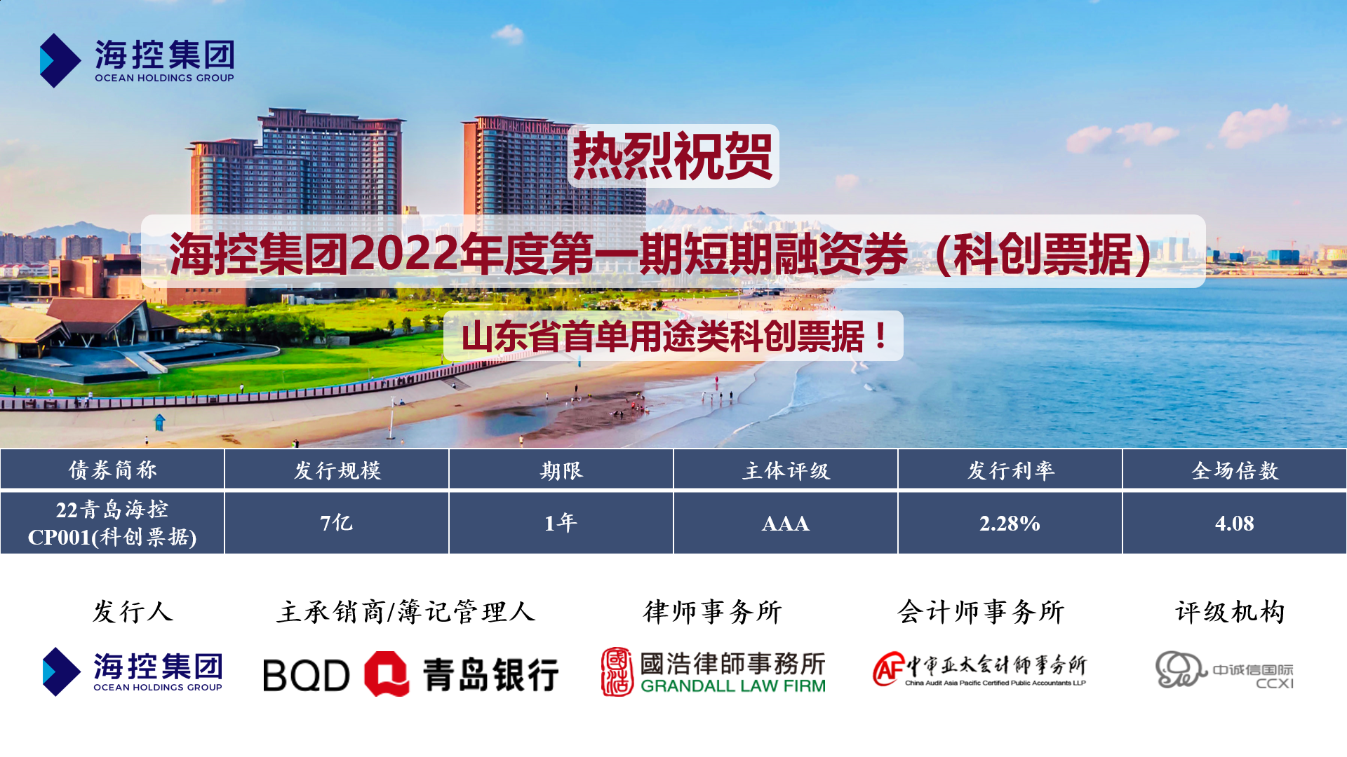 近日,海控集團“2022年度第一期短期融資券(科創票據)”成功發行,期限1年,發行金額7億元,認購倍數4.08倍,發行年利率2.28%,為山東省首單用途類科創票據。資金主要服務于青島京東方產業生產基地和海洋生物醫藥產業園區等科技創新項目建設。