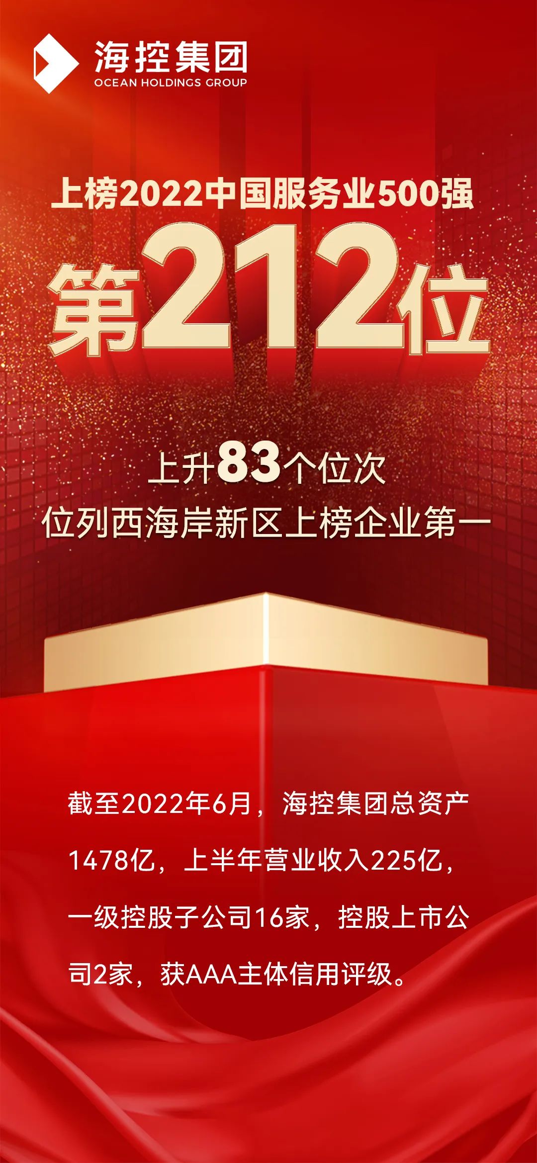 9月6日,中國企業聯合會、中國企業家協會發布2022中國服務業企業500強榜單,海控集團位列第212位,比去年上升了83個位次,位列新區上榜企業第一。