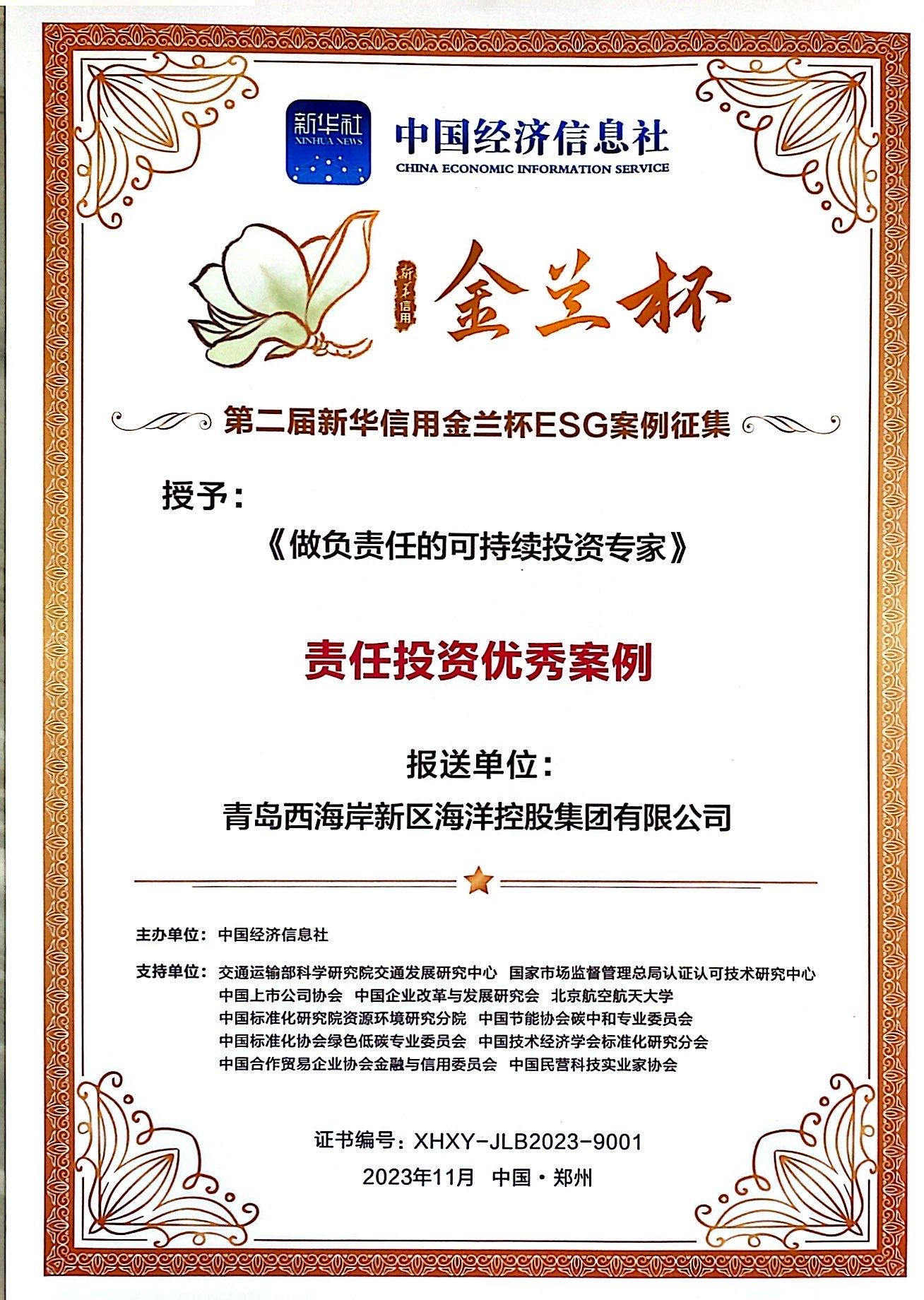 11月13日,第五屆中國(guó)城市信用建設(shè)高峰論壇企業(yè)ESG與高質(zhì)量發(fā)展論壇在鄭州舉辦。活動(dòng)現(xiàn)場(chǎng),第二屆新華信用金蘭杯ESG優(yōu)秀案例名單發(fā)布。青島西海岸新區(qū)海洋控股集團(tuán)(以下簡(jiǎn)稱“海控集團(tuán)”)憑借在新興產(chǎn)業(yè)培育、產(chǎn)業(yè)轉(zhuǎn)型升級(jí)、綠色投資等方面的卓越表現(xiàn),獲評(píng)“第二屆新華信用金蘭杯責(zé)任投資優(yōu)秀案例”。