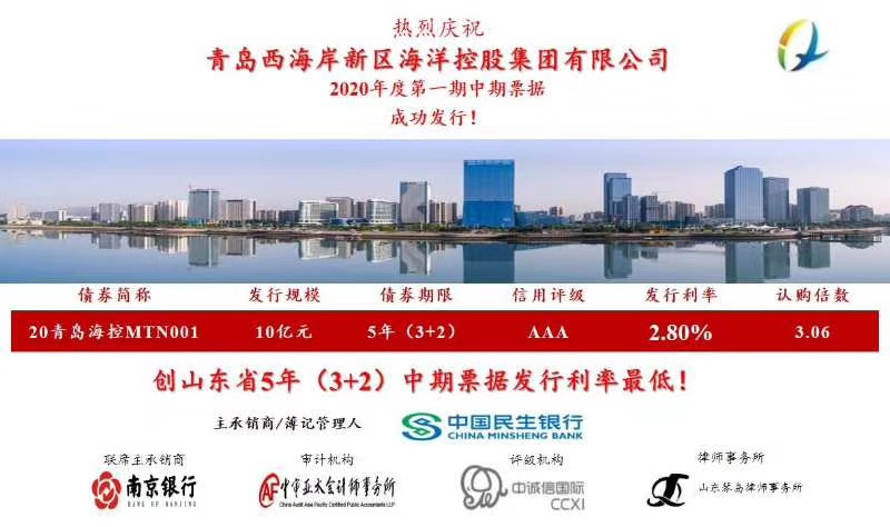 近日,海控集團2020年第一期中期票據在銀行間交易市場成功發行,發行金額10億元,期限5(3+2)年,發行利率2.80%,創山東省國有企業同期限中期票據發行票面利率最低。此次中期票據的成功發行,是海控集團與民生銀行戰略合作的成果,同時作為海控集團首次在公開市場亮相,受到資本市場高度關注,有助于提升海控集團發展實力和資本市場認可度,為服務經略海洋戰略發展奠定基礎。